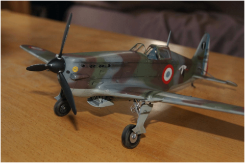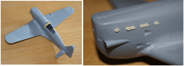 Ne reste plus qu’à fixer tous les sous-ensembles et éléments que l’on a soigneusement préparés lors des temps de séchage : trains d’atterrissage, roues, hélice, tube de Pitot, verrière, mitrailleuses, viseur, antennes…, mais aussi pour une ultime touche de réalisme, à appliquer les traces d’utilisation opérationnelle sur l’avion (on parle en modélisme de « vieillissement ») : écailles alu pour simuler les morceaux de peinture enlevés à des endroits logiques (accès au poste de pilotage, pourtour des panneaux amovibles, etc.), traces d’échappements du moteur, suie des canons des mitrailleuses, traces de terre sur les roues, fuites diverses.