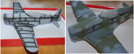 Pour accentuer encore l’effet de profondeur du camouflage, j’infiltre de la peinture sombre très diluée dans les creux et j’enlève le surplus avec du diluant dans le sens du vent relatif. Le temps de séchage réglementaire et j’unifie le tout avec une couche de vernis mat. C’est à ce moment précis que le camouflage apparaît dans toute sa profondeur et sa splendeur et que la maquette cesse d’être un jouet et devient une reproduction à échelle réduite.