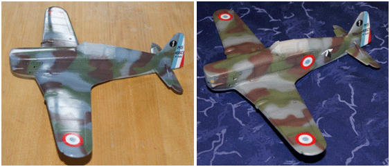 On applique d’abord la couleur gris bleu clair de l’intrados et on la masque après séchage complet pour la protéger. Vient alors le gris bleu, le vert armée et enfin le brun « ombre calcinée » des surfaces supérieures, réalisées à main levée. On éclaircit le centre des panneaux avec la même teinte, légèrement éclaircie de blanc pour donner là-encore du relief. Le tout une fois sec, on applique une couche de vernis brillant sur tout l’appareil, pour préparer et faciliter la pose des décalques, qui adhéreront mieux. Ces derniers se posent sans le moindre problème, en faisant cependant attention au drapeau de dérive, qui nécessitera quelques retouches.