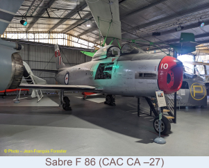 Le Sabre F 86 (CAC CA –27) immatriculé A94-910, donné au musée en 2019, était le premier chasseur australien à ailes en flèche de la Royal Australian Air Force (RAAF). Achetés à 112 exemplaires, il a participé à la lutte anti-insurrection en Malaisie et en Indonésie entre 1958 et 1960.