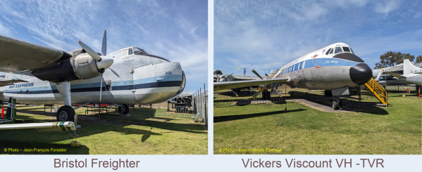 Les avions civils sont représentés par un imposant Bristol Freighter VH –ADL, avion de transport développé à la fin des années 40, propulsé par deux moteurs Bristol Hercules 734 de 1890 chevaux, capable de transporter une charge de 3,4 tonnes. Un quadrimoteur Vickers Viscount aux couleurs de la Trans Australia Airlines illustre l’importance de l’aviation civile pour cette île- continent qu‘est l’Australie.
