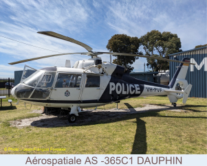 Un hélicoptère Aérospatiale AS –365 C 1 Dauphin, aux couleurs de la police de l’Etat de Victoria, rappelle que l’Australie a été équipée de matériels français dans les années 70.