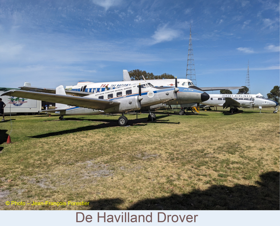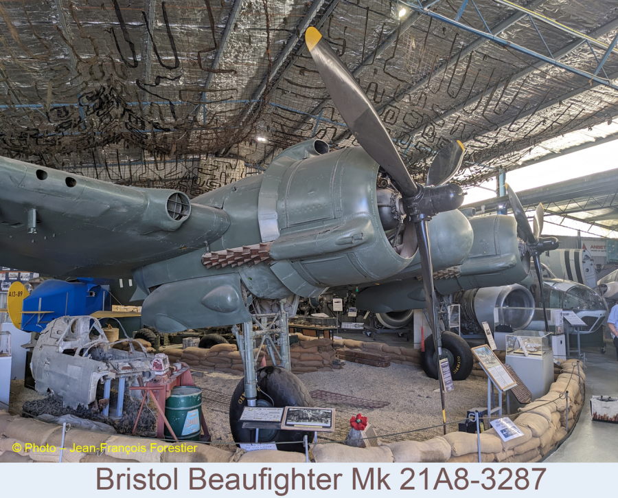 Le Bristol Beaufighter Mk 21A8-328, avion d’attaque multi-rôle, surnommé par les japonais "la mort qui chuchote" est doté d’une excroissance sous la verrière qui protége un pilote automatique de la marque Sperry. Il côtoie un biplan De Havilland Gypsy Moth DH60. Construit en 1929, cet appareil était la propriété de Nancy Lyle qui fut la première femme à réaliser les vols entre Melbourne et Adélaïde ainsi que Melbourne et la Tasmanie en 1933.